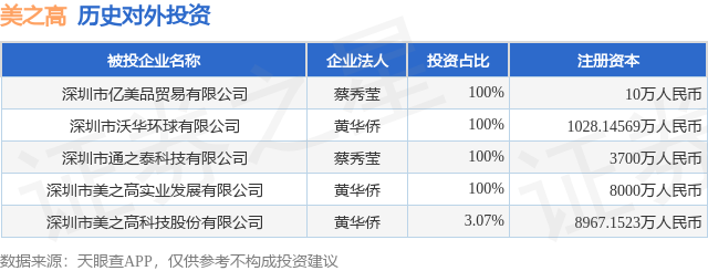 本站消息,根据天眼查APP显示,美之高(920765.BJ)新增一起对外投资事件,被投资公司为深圳市亿美品贸易有限公司点搭网配资,法定代表人蔡秀莹,投资占比为100%。该公司从事批发业,注册资本为10万人民币。目前,美之高共存在对外投资5项,详见下表: