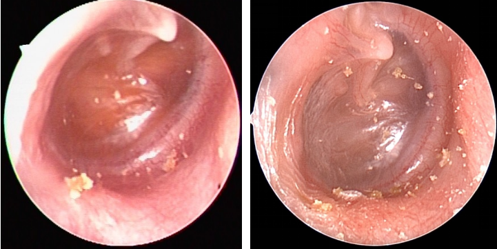 左图为右耳置管术后再发积液,右图为综合治疗2月后积液吸收消退
